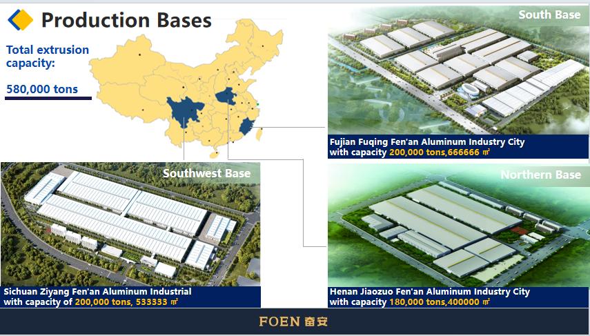 FENAN ALUMINUM CO., LTD. ก่อตั้งขึ้นในปี 1988 เป็นองค์กรการผลิตอัจฉริยะที่ครอบคลุมซึ่งเชี่ยวชาญด้านการวิจัยและพัฒนา การผลิต และการขายตรงของผลิตภัณฑ์อลูมิเนียมต่างๆ รวมถึง โปรไฟล์อลูมิเนียมสถาปัตยกรรม โปรไฟล์อลูมิเนียมอุตสาหกรรม - อลูมิเนียมน้ำหนักเบาสำหรับยานยนต์ , และ ระบบประตูและหน้าต่าง ด้วยพื้นที่รวมกว่า 2,000 เอเคอร์และฐานการผลิต 8 แห่ง ทำให้มีศักยภาพด้านการวิจัยที่แข็งแกร่งผ่านทางสถาบันวิจัยเทคโนโลยีอะลูมิเนียมและโรงเรียนธุรกิจ