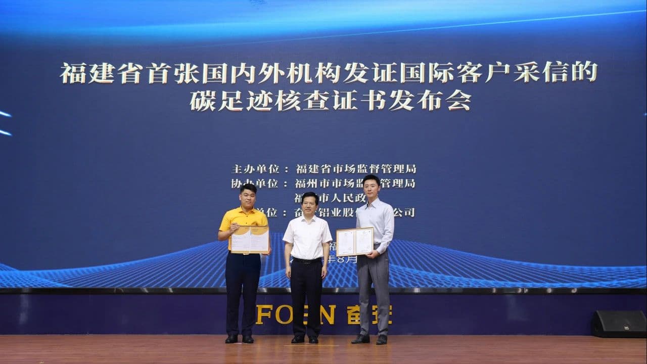 เมื่อวันที่ 19 สิงหาคมที่ผ่านมา บริษัท เฟิน อะลูมิเนียม จำกัด ได้มอบใบรับรองการตรวจสอบคาร์บอนฟุตพริ้นท์ฉบับแรกในมณฑลฝูเจี้ยน ซึ่งออกโดยหน่วยงานรับรองทั้งในและต่างประเทศ และได้รับการยอมรับจากลูกค้าต่างประเทศอย่างเป็นทางการ พิธีมอบรางวัลจัดขึ้นที่บริษัท เฟิน อะลูมิเนียม จำกัด โดยมีผู้นำที่เข้าร่วม ได้แก่ หวง สุ่ยมู่ เลขาธิการกลุ่มผู้นำพรรคและผู้อำนวยการสำนักงานกำกับดูแลตลาดมณฑลฝูเจี้ยน, เฉิน จงเซิง เลขาธิการกลุ่มผู้นำพรรคและผู้อำนวยการสำนักงานกำกับดูแลตลาดฝูโจว และหลิน เฮ่อจือ รองนายกเทศมนตรีเมืองฝูชิง นอกจากนี้ยังมี หวง เฟิน ประธานบริษัท เฟิน อะลูมิเนียม จำกัด พร้อมด้วยบุคลากรที่เกี่ยวข้องจากหน่วยงานกำกับดูแลตลาดมณฑลฝูเจี้ยน และสถาบันมาตรวิทยามณฑลฝูเจี้ยน ตัวแทนจาก China Quality Mark Certification Group และ Intertek Testing Services (Shanghai) Co., Ltd. เข้าร่วมด้วย